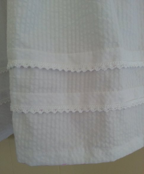 fast spets och remsor av samma tyg som i kjlolen. |
