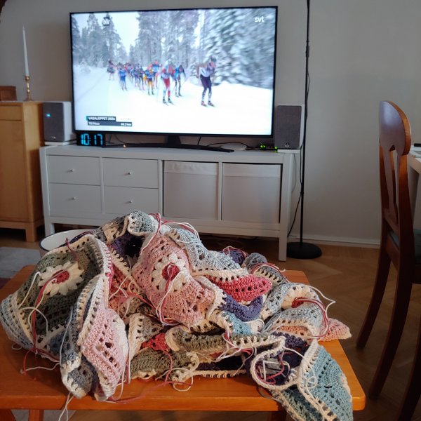 satte mig framför TV:n och virkade ihop rutor. Jag skulle gärna